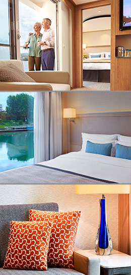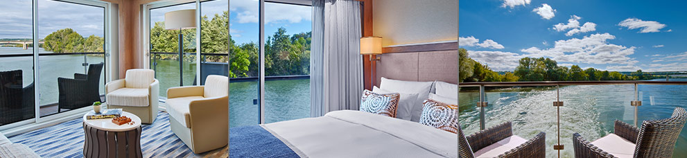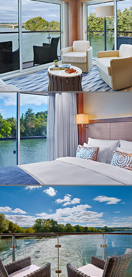 Enjoy the pure luxury of our largest staterooms (only two on board each Viking Longship), offering fine hotel-style amenities. Your separate living area has a private wraparound veranda with 270˚ views, and the spacious bedroom expands your horizons with a French balcony.