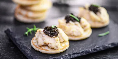 This traditional Russian dish is somewhat like pancakes or crêpes, but made with a yeast dough that is allowed to rise. Buckwheat, a staple flour of colder climates, is typically incorporated. Often, the blini are made bite-sized and served with a variety of toppings from savory caviar and smoked salmon to sweet cream and fruit for a dessert.