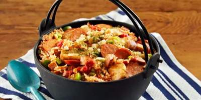 A slow simmered dish highlighting the wonderful flavors of the bayou, Jambalaya is believed to be an adaptation of Spanish paella (using local ingredients) by early Louisiana settlers. If you can find andouille sausage, it adds an authentic flavor. You can also substitute crawfish or shrimp for chicken—just stir in at the end, cooking just until it is opaque.