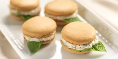 Surprise your friends with this savory macaron, a twist on the traditionally sweet cookie with its mild crust and tangy center of feta, fresh tomatoes and basil. When you assemble them, be sure to spread the filling gently or even use a piping bag to prevent damaging the delicate meringue cookies.