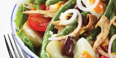 This salad’s name, pronounced “sah LAHD nee SWAHZ,” reflects its origin of Nice, France. The ingredients—particularly tomatoes, capers and olives—also harken back to the flavors of sunny Provence. Enjoy this hearty salad, substantial enough by itself for a lunch or light dinner, with a glass of chilled white wine and a crusty French epi or baguette.