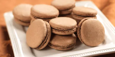 French macarons (from the Italian maccherone, or meringue) are typically a sweet meringue confection filled with preserves, caramel or buttercream; these chocolate ones are a light-as-a-feather French treat. The sugar syrup method results in a delicate, delicious meringue subtly flavored with almonds, and the filling is intensely rich and decadent.