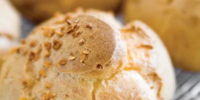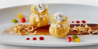The term profiteroleis believed to have come from the French verb profiter, to profit, and originally meant a small gratuity or gift such as one might give to a servant. This rendition, with fresh fruit, coconut purée and toasted coconut, mascarpone and cream, is indeed a fine gift to the taste buds.