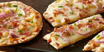Flammkuchen, which literally translates from German as “flame cake,” became popular in the 1960s at the beginning of the pizza craze. You will find variations of it in much of Europe. With both a thinner crust and topping layer than a typical pizza, it is perfect served with a generous side salad for lunch or a light supper.