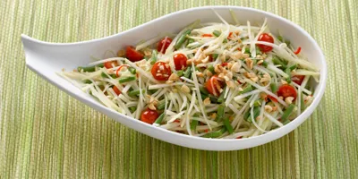 In Cambodia, this is called Bok Lahong (“pounded papaya” in Khmer); in Vietnam, Goi Du Du (pronounced “guy dodo”); and in Thailand, it is known as Som Tam. However you say it, this delicate combination of contrasting flavors is refreshing and delicious. If you use all the chilies, this dish can be spicy, so feel free to adjust to your taste.