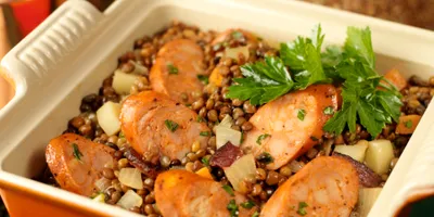 The literal translation is “lentil pot” (linsen+ eintopf), but the recipe results are magic. Chock-full of sausage, bacon and veggies, this hearty stew is a welcome winter meal. This German dish can cook largely unattended, with just an occasional stir once it gets going, and makes a substantial meal served with warm, crusty bread.