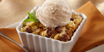 Recipes for bread pudding date back to medieval times, and are a frugal but delicious way to use up stale bread. This version is an easy-to-make German apple bread pudding. Rich with fruit and raisins, its flavor is reminiscent of apple pie. It is particularly tasty served with a high-quality vanilla ice cream or custard sauce.