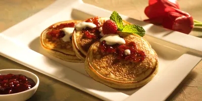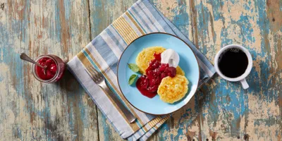 A typical dish of Russia, this delightfully different dessert is made with fresh farmers’ cheese. In Ukraine, it is often served for breakfast, so you can try it for brunch too. The farmers’ cheese is very mild, and a good foil for topping it with strawberry ragout as below, but you could experiment with sour cream, jam, or applesauce.