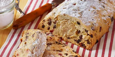 Stollen is the classic German Christmas fruitcake: a rich yeast dough studded with nuts and dried fruit. This particular version uses raisins and candied fruit as well as marzipan. It is good served with butter and jam while still warm from the oven, and is also delicious days later toasted and topped with honey or preserves.