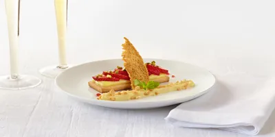 This elegant dessert is a deconstructed tart that is enhanced by the subtle flavors of vanilla, strawberry, champagne and Specht Kirschwasser, a German clear cherry brandy.